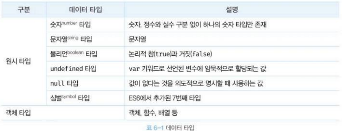 - 자바스크립트 엔진은 데이터 타입. 즉 값의 종류에 따라 정해진 크기의 메모리 공간을 확보