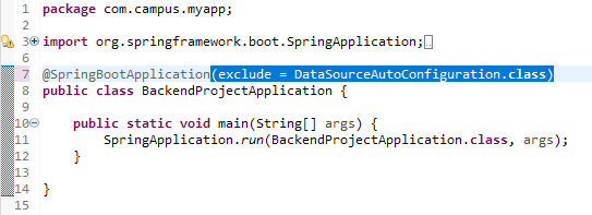 2) (이번에 사용할 해결 방법)서버가 필요하지 않을 시 src/main/java 안의 com.campus.myapp 패키지 안에 '프로젝트명Application.java'파일의 @SpringBootApplication 어노테이션에 (exclude = DataSourceAutoConfiguration.class)를 추가해준다.