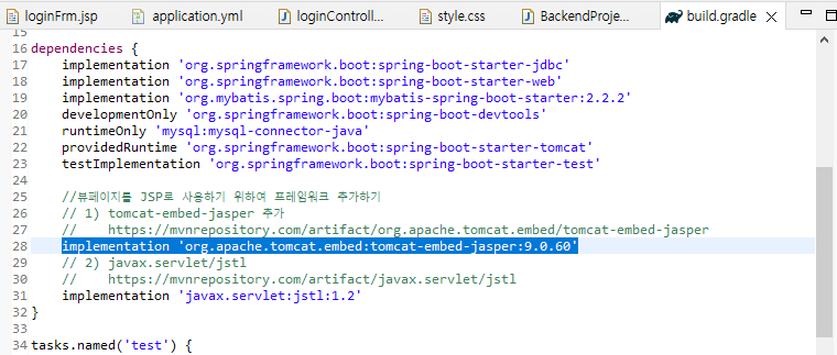 1) build.gradle 파일의 dependencies에 tomcat-embed-jasper implementation 추가,