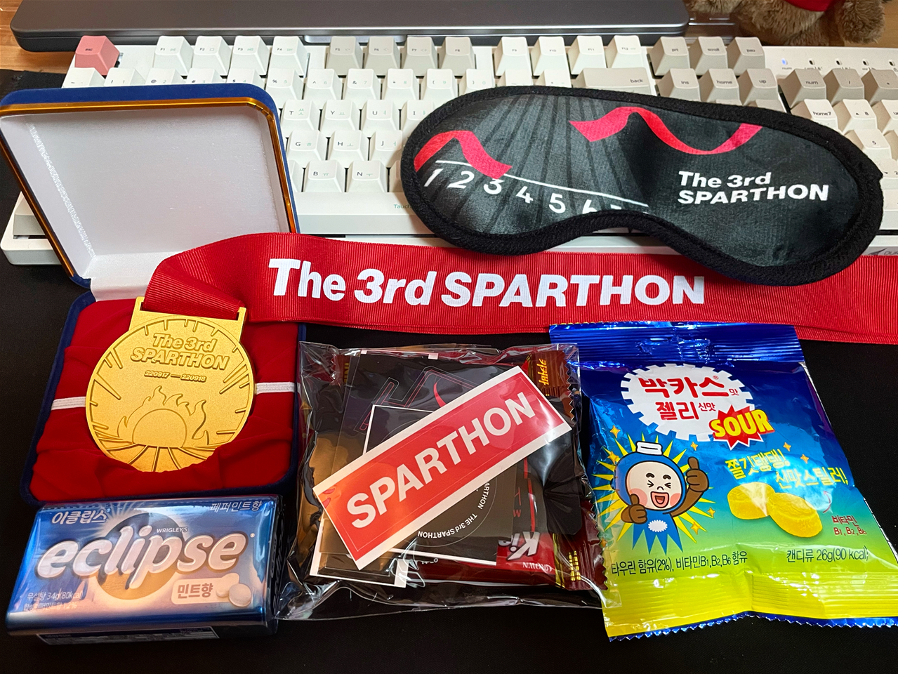 스파르톤 후 휴식 때 쓰라고 보내주신 안대와, 스파트론 진행 시간동안 심심한 입을 달랠 커피와 초콜릿 사탕 그리고 원기 회복을 위한 박카스 젤리까지..! 시작부터 신나는 밤샘코딩이다..!