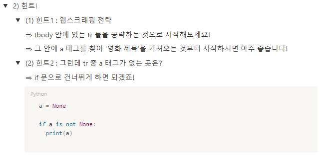 #제목 : 1) tr내의 첫번째 a태그의 'text'값 / 2) tr내의 td 중 'title'라는 클래스를 가진 td 안 a태그의 'text'값