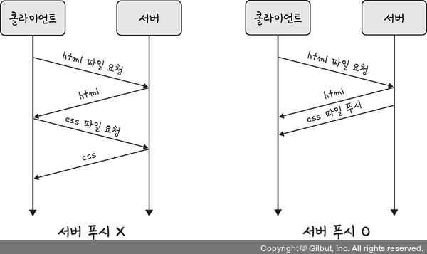 - HTTP/2 : 클라이언트 요청 없이 서버가 바로 리소스를 푸시 가능.