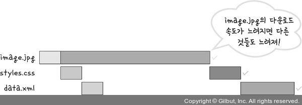- 단점 : 문서 안에 포함된 다수의 리소스(이미지, css 파일, script 파일)를 처리하려면 요청할 리소스 개수에 비례하여 대기 시간이 길어짐