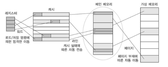 1. 메모리 계층 : 레지스터, 캐시, 저장장치.