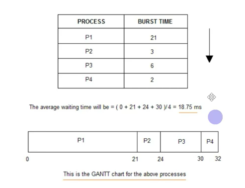 - 긴 시간을 가진 프로세스가 실행되지 않는 현상(starvation)이 일어나며 평균 대기 시간이 가장 짧음.