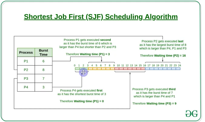 2) SJF(Shortest Job First) : 실행 시간이 가장 짧은 프로세스를 가장 먼저 실행하는 알고리즘