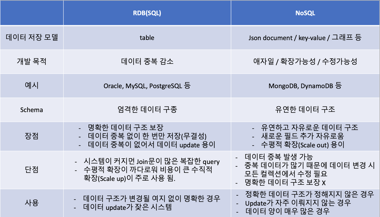 ✅ 관계형 데이터베이스(RDB)는 사전에 엄격하게 정의된 DB schema를 요구하는 table 기반 데이터를 구조를 갖는데 반해, 비관계형 데이터베이스인 NoSQL은 table 형식이 아닌 비정형 데이터를 저장할 수 있도록 지원합니다.