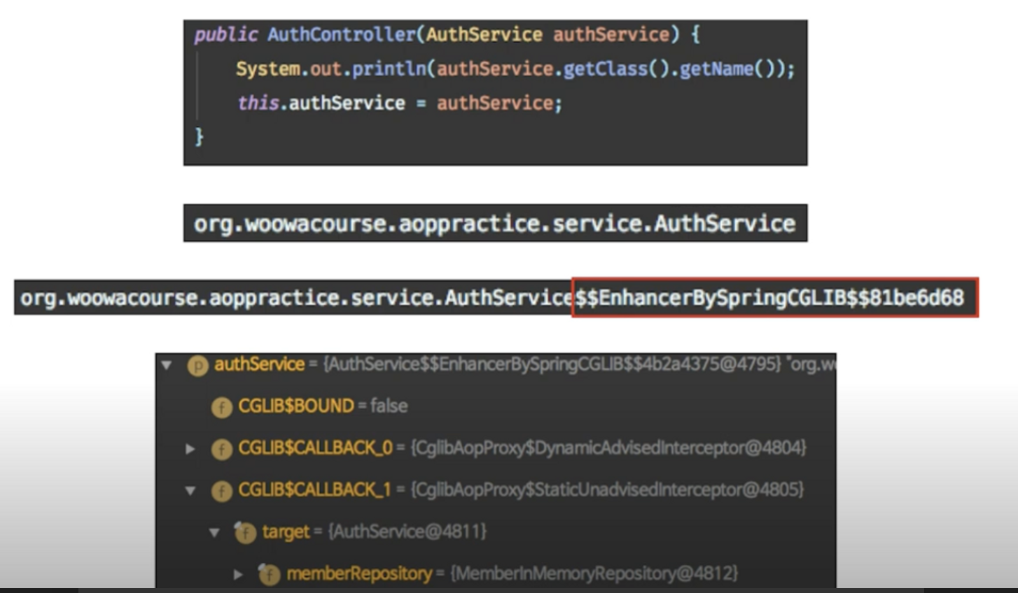 - 타켓클래스의 className을 찍어보면 타겟클래스명$$EnhancerBySpringCGLIB$$코드로 찍히며, 디버깅해보면 target에 원래의 타겟 클래스가 들어가 있음을 알 수 있음