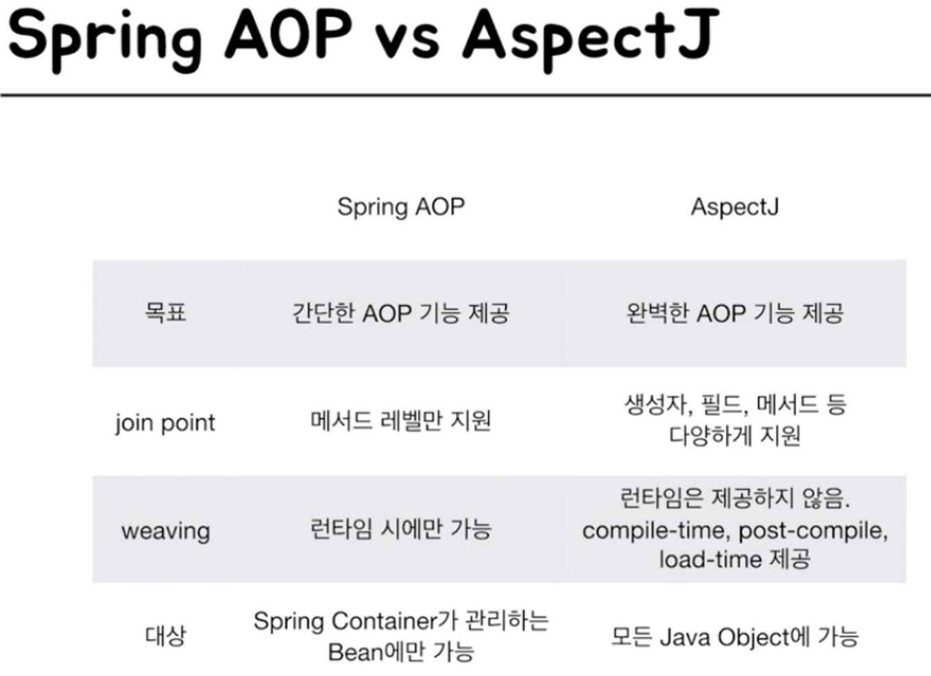 - 스프링 AOP는 AspectJ를 직접 사용하는 것이 아니라, 문법을 차용하고 프록시방법의 AOP를 사용하는 것