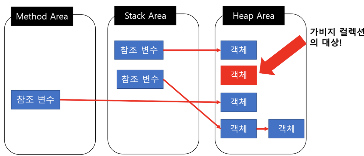 - JAVA에서 객체들은 실질적으로 Heap영역에 생성되고 Method Area나 Stack Area, Root Area에서는 Heap에 생성된 객체의 주소만 참조하는 형식 GC의 대상