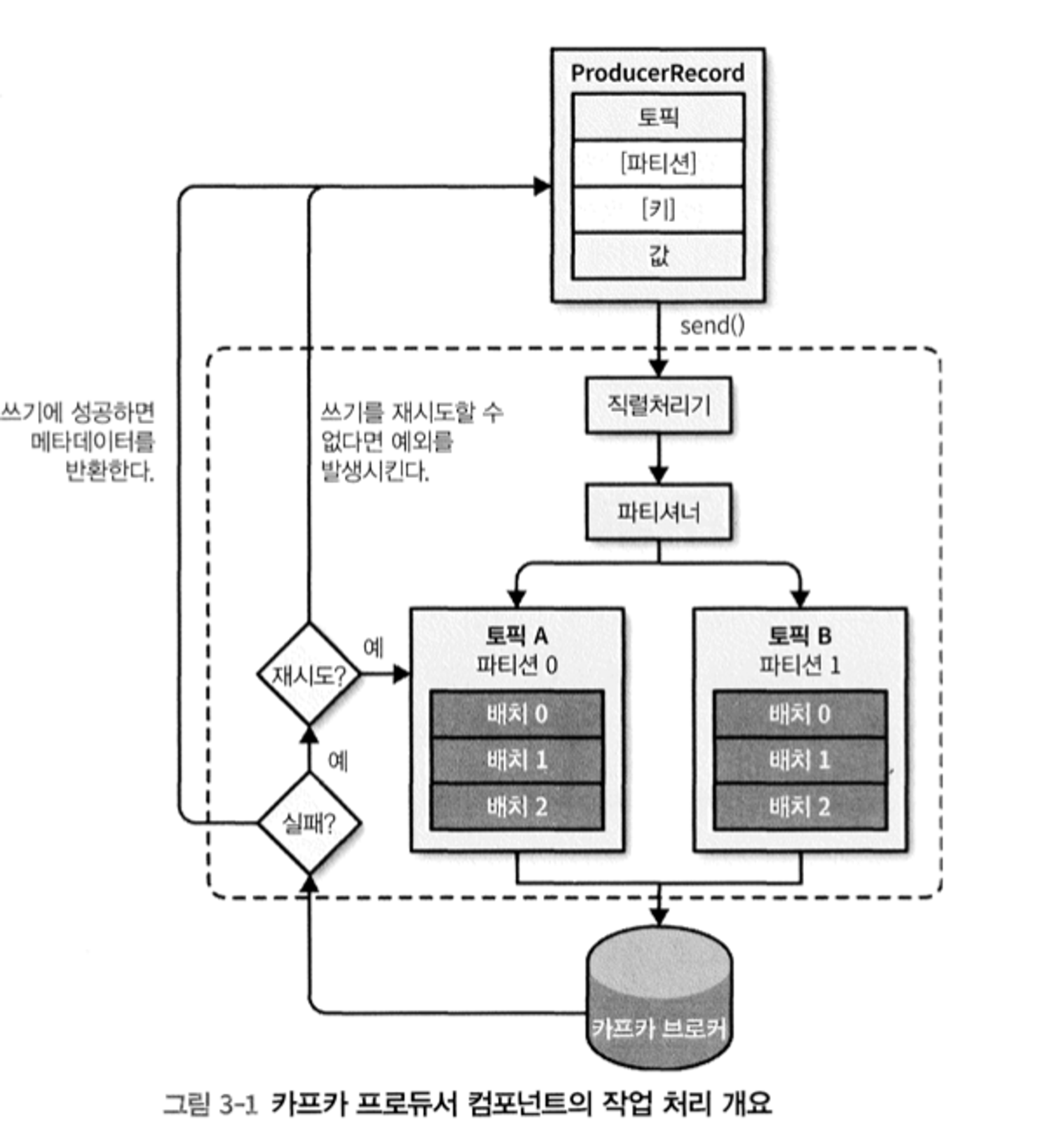 - 카프카 프로듀서는 자동으로 전송 실패한 메시지를 재전송 시도하기 때문에 대부분의 경우 성공적 전달