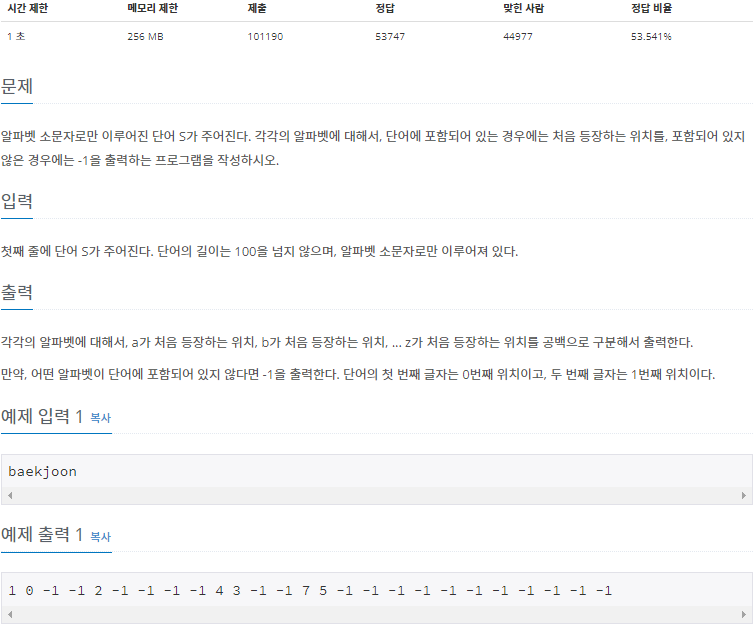 각각의 알파벳에 대해서, a가 처음 등장하는 위치, b가 처음 등장하는 위치, ... z가 처음 등장하는 위치를 공백으로 구분해서 출력한다. 만약, 어떤 알파벳이 단어에 포함되어 있지 않다면 -1을 출