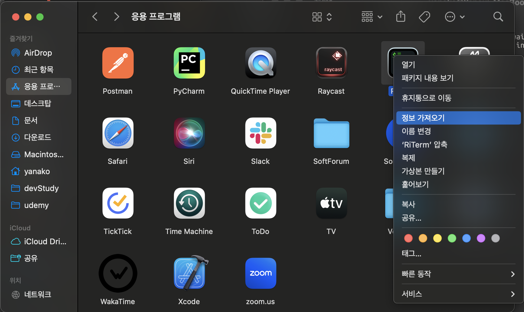 4. rosetta전용으로 사용할 iTerm 우클릭 - "정보 가져오기" - "Rosetta를 사용하여 열기" 활성화