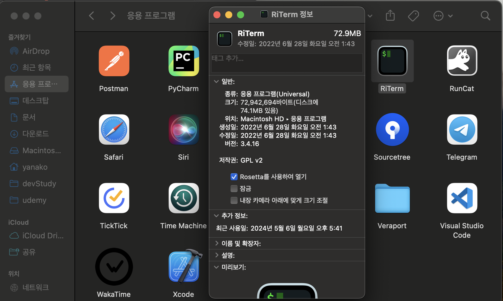 짜잔..! 이렇게 Rosetta를 사용해 실행시킬 iTerm을 생성했다.