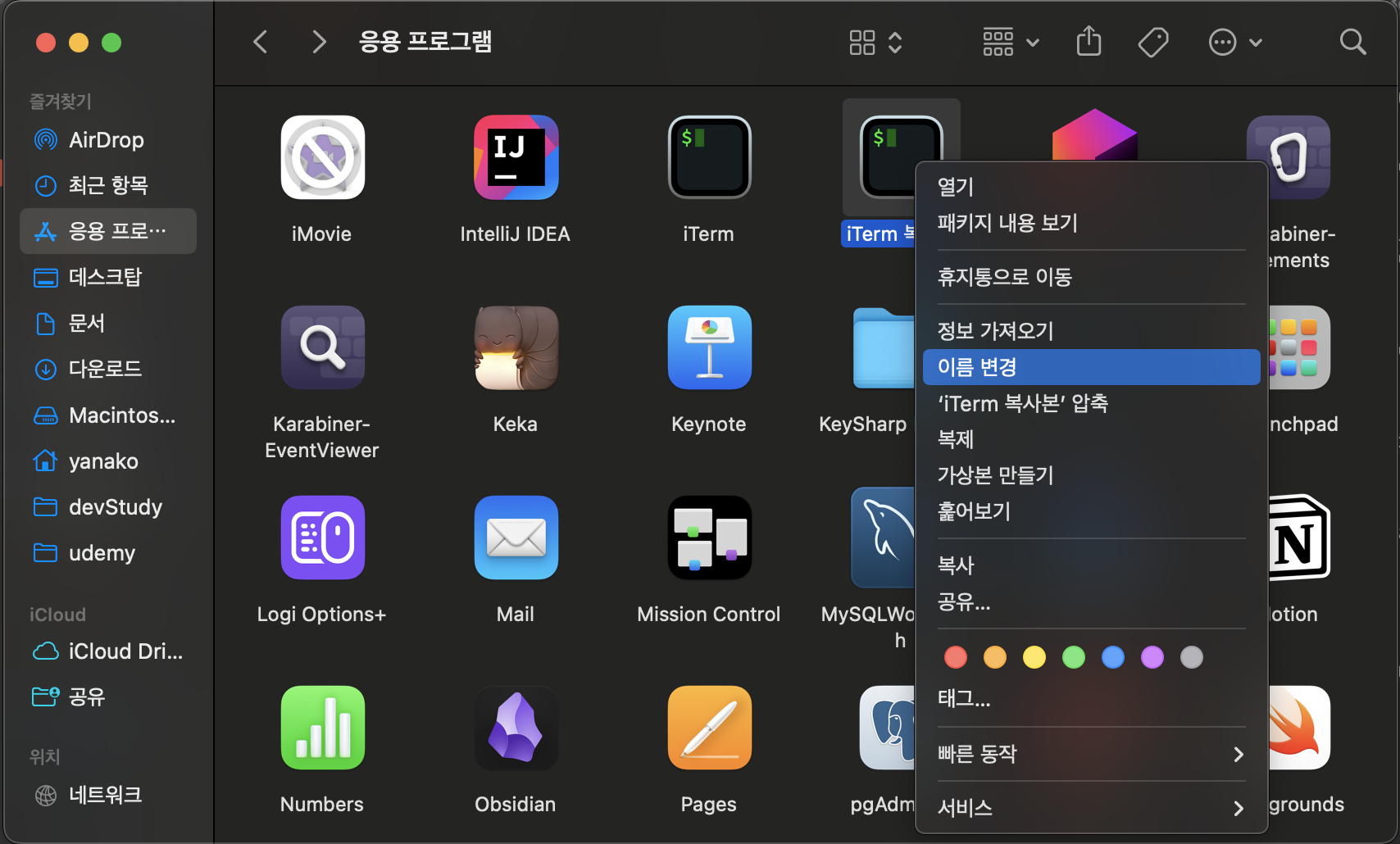 3. iTerm 복제본 우클릭 - "이름변경"선택 - 원하는 이름으로 변경(필자는 'R'osetta 환경이기에 앞에 r을 붙여주었다)