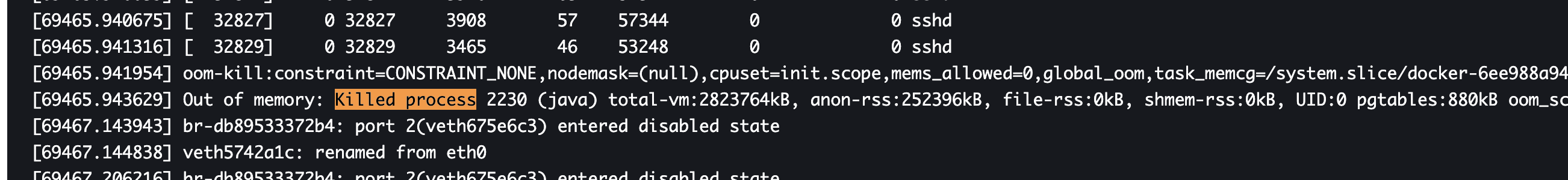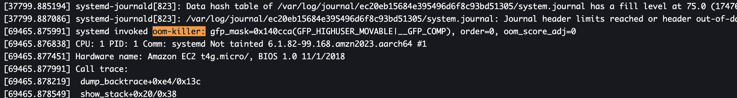 로그를 통해, 시스템 메모리가 부족하여 OOM Killer가 Java 프로세스를 종료시킨 것을 확인했다.