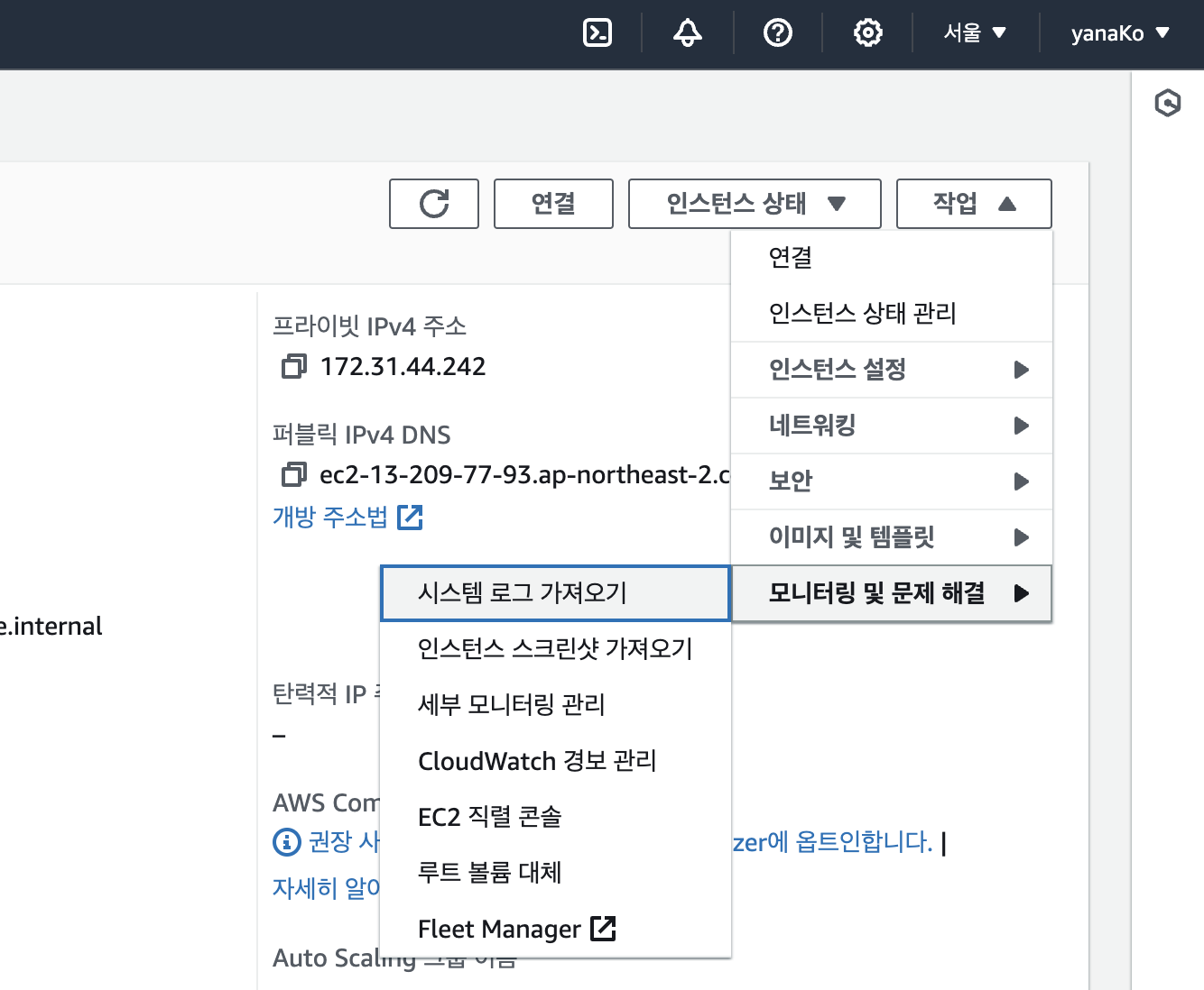 - AWS문서에서 말하듯이 우선 인스턴스를 재시작 한 뒤, log를 확인해보고자 했다.