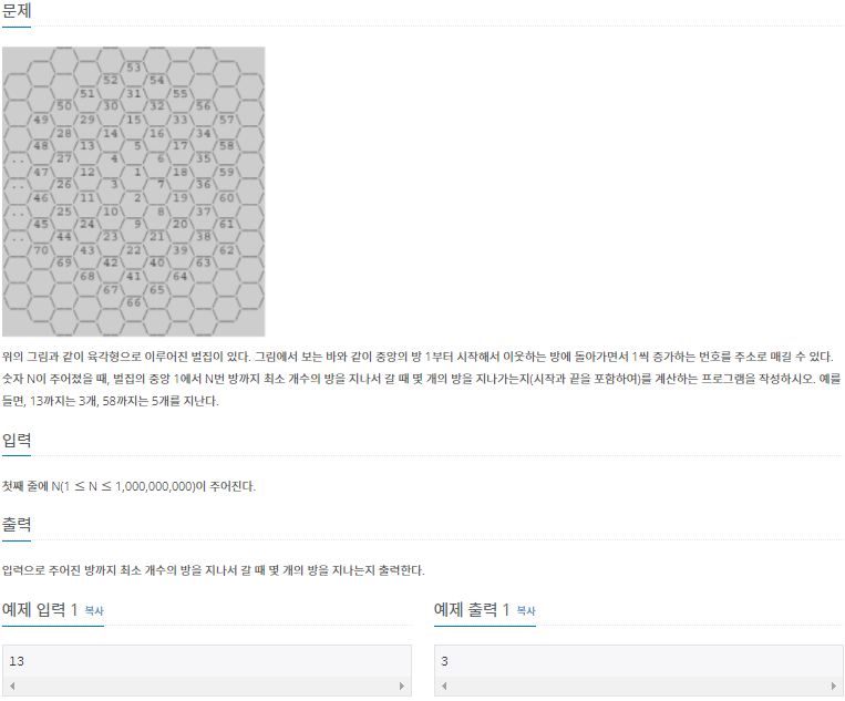 위의 그림과 같이 육각형으로 이루어진 벌집이 있다. 그림에서 보는 바와 같이 중앙의 방 1부터 시작해서 이웃하는 방에 돌아가면서 1씩 증가하는 번호를 주소로 매길 수 있다. 숫자 N이 주어졌