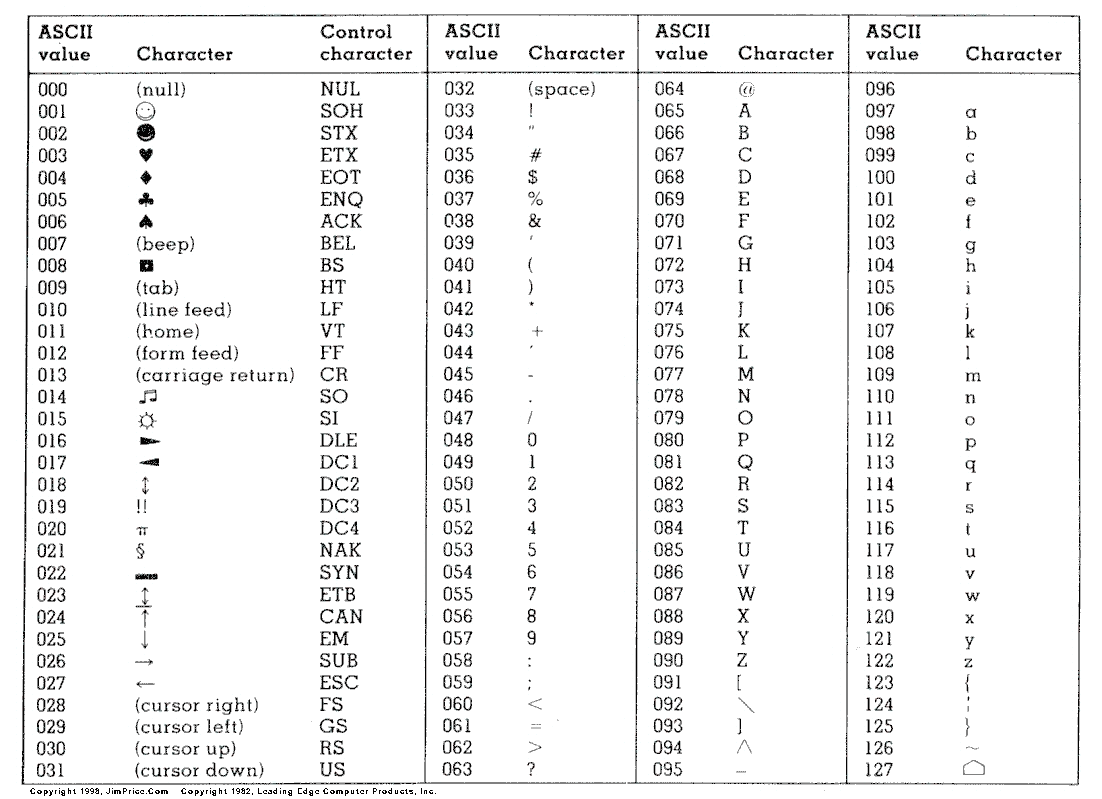 1. 아스키코드 문자: 알파벳 대소문자와 여타 기호를 10진법 수에 매치시켜놓은 것.