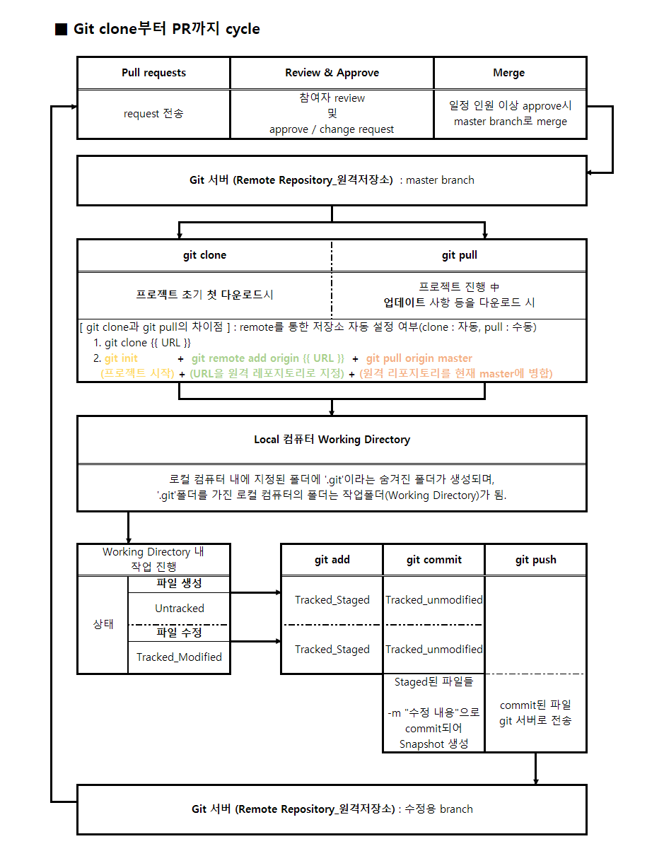 ㄴ 원격 저장소의 master branch(이외에 파일을 받아올 branch)에서 clone 혹은 pull.