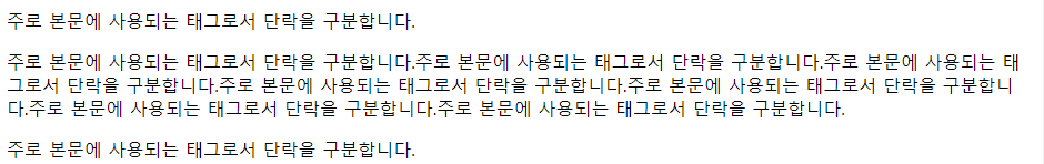 <p>주로 본문에 사용되는 태그로서 단락을 구분합니다.주로 본문에 사용되는 태그로서 단락을 구분합니다.주로 본문에 사용되는 태그로서 단락을 구분합니다.주로 본문에 사용되는 태그로서 단락을 구분합니다.주로 본문에 사용되는 태그로서 단락을 구분합니다.주로 본문에 사용되는 태그로서 단락을 구분합니다.주로 본문에 사용되는 태그로서 단락을 구분합니다.</p>