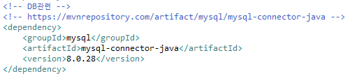 https://mvnrepository.com/artifact/mysql/mysql-connector-java/8.0.28 에서 MySQL Connector/ "J" 의 메이븐 코드 가져다가